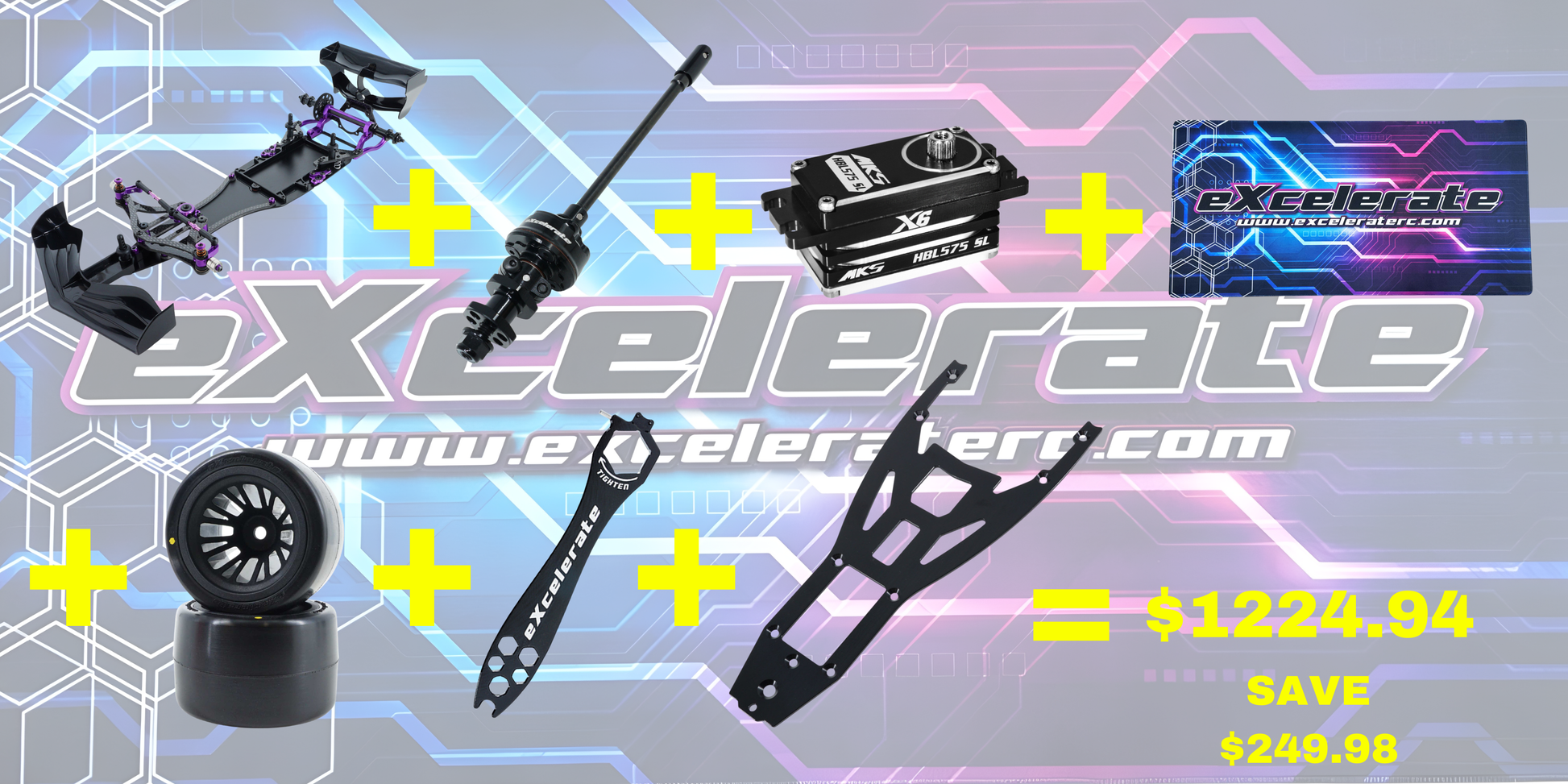This Prodigy F1 combo incorperates the Essentials plus the GP combo. The addition of the pit matt will provide a nice work space in your pit area and add some eXcelerate team colours. The steel chassis will provide an added tunnig option for asphalt in terms of flex and durablity over the alloy chassis.
